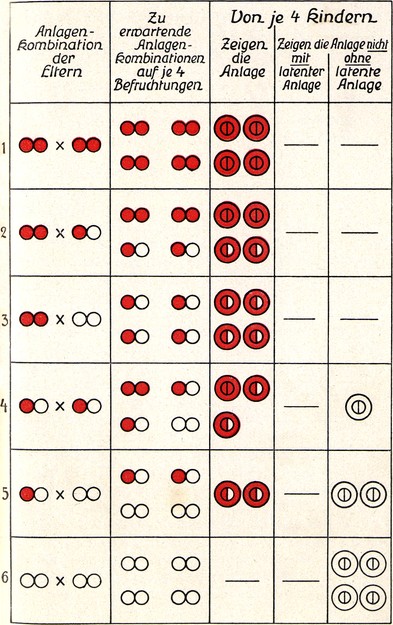 Höchst merkwürdig ist bei dieser glücklicherweise seltenen Krankheit, daß sie nur bei den männlichen Nachkommen auftritt und nur durch die selbst gesund bleibenden weiblichen Nachkommen vererbt wird. Diese Latenz (das Verborgenbleiben) der Erbeigenschaften in den weiblichen Gliedern eines Familienstammes kommt übrigens auch bei anderen krankhaften sowie bei lebensnützlichen Anlagen (Talenten) vor; geradeso, wie Frau und Mann gewisse Besonderheiten der Merkmale des anderen Geschlechtes (z. B. des Bartwuchses, der Form und Größe der Brüste) verborgen auf ihre Söhne bzw. Töchter vererben.
