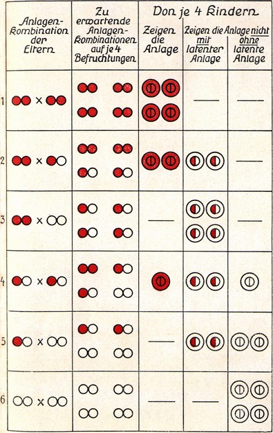 Wenn trotzdem selbst die Kinder gleicher Eltern in der Regel untereinander verschieden sind und nicht selten sogar sehr auffällige Unterschiede zeigen, so rührt dies — wenn wir von der merkwürdigen, noch nicht genügend aufgeklärten Tatsache der sog. Mutation, d. h. des plötzlichen Neuauftretens oder Verlustes einer vererbbaren Eigenschaft oder Anlage in einem Individuum, hier absehen — hauptsächlich von zwei Umständen her. Erstens davon, daß kaum jemals die Bedingungen, unter denen sich zwei Individuen entwickeln, ganz gleich sind und die Verschiedenheit der Lebensbedingungen bei gleichen Anlagen Verschiedenheiten des Aussehens und der Leistungen der Individuen herbeiführt (Modifikation, Lebenslage-Variation). Zweitens aber — und dies ist viel wichtiger! — davon, daß kaum jemals die Kinder desselben Elternpaares tatsächlich gleiche Anlagen erhalten.