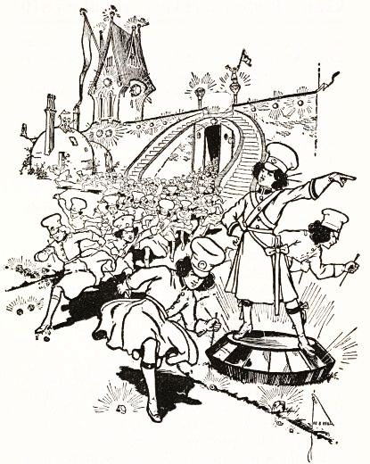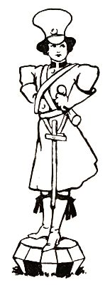So when her soldiers, who spent most of their time making fudge in the palace kitchens, counseled Jinjur to resist, she listened to their foolish prattle and sent a sharp defiance to Glinda the Good and the Princess Ozma. The result was a declaration of war, and the very next day Glinda marched upon the Emerald City with pennants flying and bands playing,[Pg 274] and a forest of shining spears sparkling brightly beneath the sun's rays.