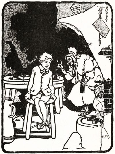The boy didn't like this speech, for it sounded like a threat; but he happened to remember he had nuts in his pocket, so he cracked some of those and ate them while the woman rose, shook the crumbs from her apron, and hung above the fire a small black kettle.