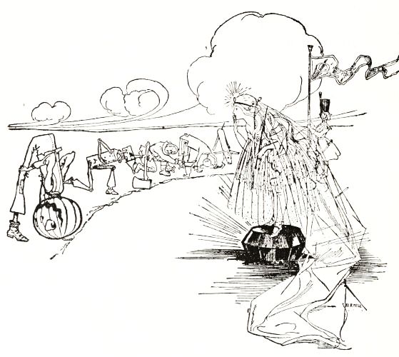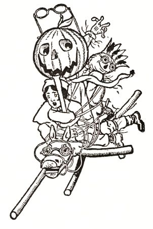 The child had no playmates, so he did not know that boys often dig out the inside of a "pumpkin-jack," and in the space thus made put a lighted candle to render the face more startling; but he conceived an idea of his own that promised to be quite as effective. He decided to manufacture the form of a man, who would wear this pumpkin head, and to stand it in a place where old Mombi would meet it face to face.