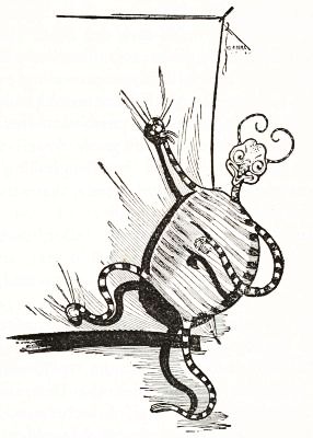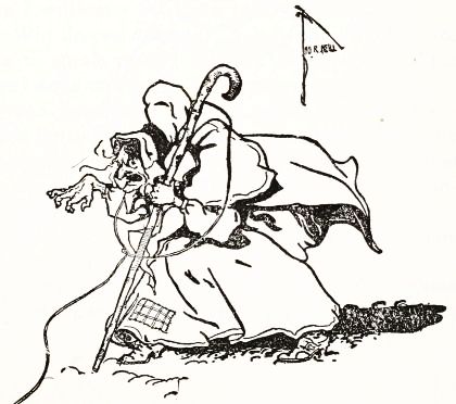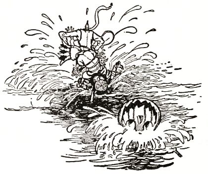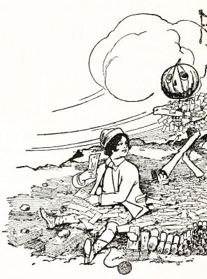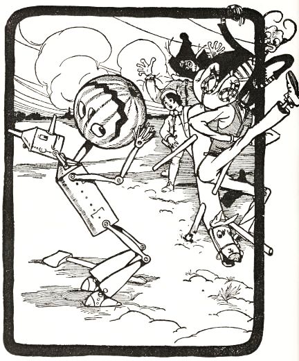 "Jack's all right, and works fine!" he said to himself, panting with the unusual exertion. But just then he discovered the man's left arm had fallen off in the journey; so he went back to find it, and afterward, by whittling a new and stouter pin for the shoulder-joint, he repaired the injury so successfully that the arm was stronger than before. Tip also noticed that Jack's pumpkin head had twisted around until it faced his back; but this was easily remedied. When, at last, the man was set up facing the turn in the path where old Mombi was to appear, he looked natural enough to be a fair imitation of a Gillikin farmer,—and unnatural enough to startle anyone that came on him unawares.