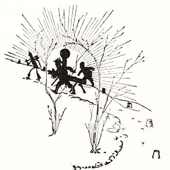 The Witch squatted upon the ground and kindled a tiny fire of dried herbs, which she drew from her bosom. When the blaze shot up and burned clearly old Mombi scattered a handful of magical powder over the fire, which straightway gave off a rich violet vapor, filling all the tent with its fragrance and forcing the Saw-Horse to sneeze—although he had been warned to keep quiet.