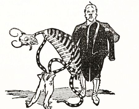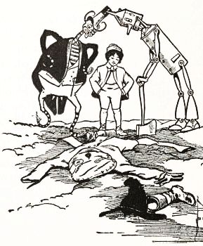 While Mombi was thus occupied Tip strolled back, with his pockets full of nuts, and discovered the old woman standing beside his man and apparently not the least bit frightened by it.