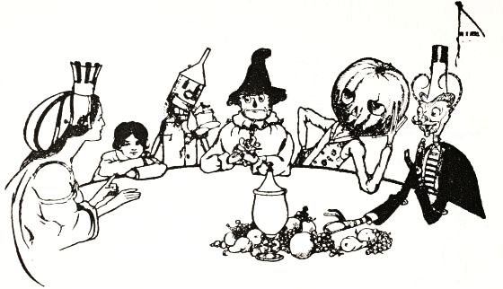 At once the men of the Emerald City cast off their aprons. And it is said that the women were so tired eating of their husbands' cooking that they[Pg 277] all hailed the conquest of Jinjur with joy. Certain it is that, rushing one and all to the kitchens of their houses, the good wives prepared so delicious a feast for the weary men that harmony was immediately restored in every family.