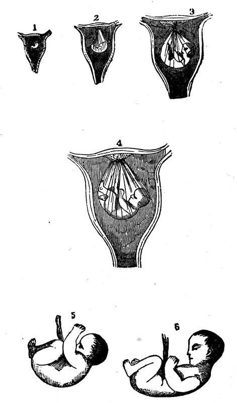 About the fourth week, it resembles a tadpole, the appendage or tail being probably the spinal marrow; a small point is perceived below the head which pulsates and indicates the region of the heart; below this the abdomen appears. Thus, the brain, spinal marrow and heart are first called into action, the other parts being brought forward as required by nature.