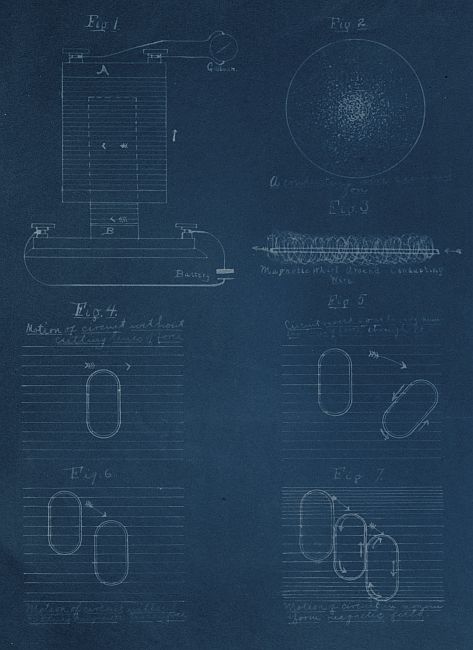 Practically Faraday’s principle means just this: by moving a wire across a space where there are magnetic lines, the motion of the wire as it cuts the magnetic lines sets up around the cutting wire a magnetic whirl or in other words sets up a current in that wire.