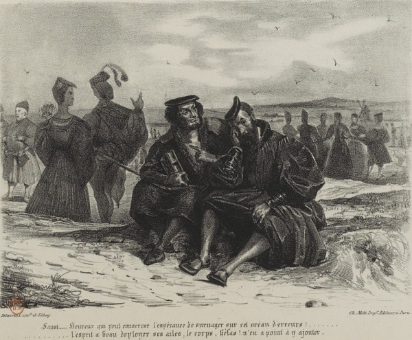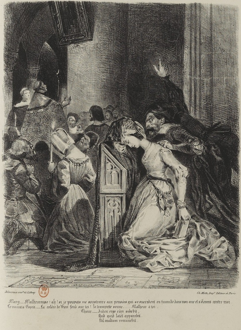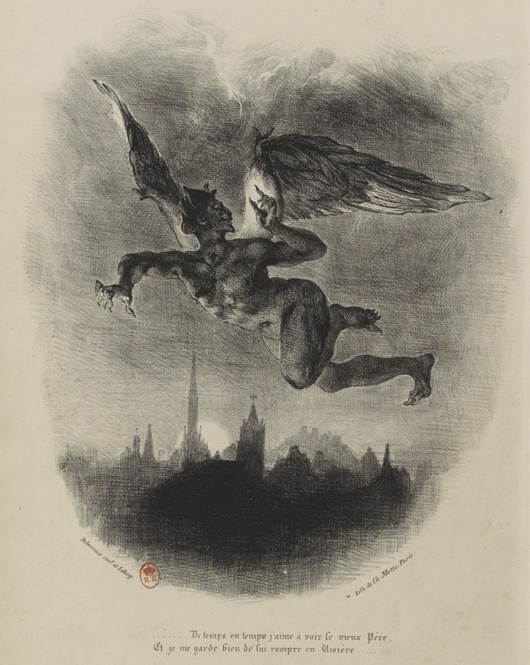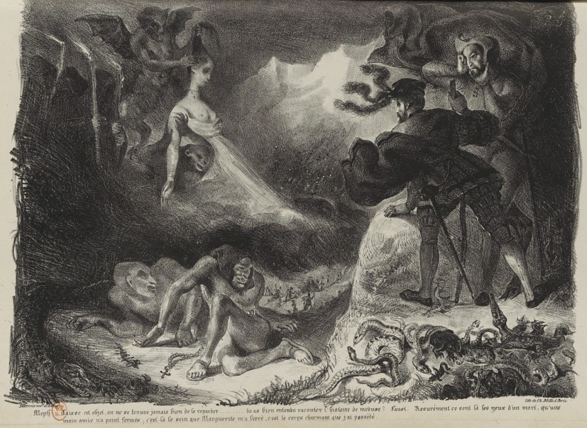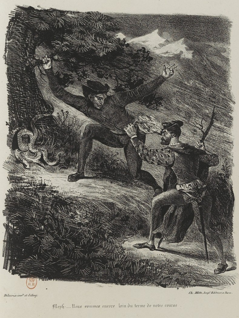 Ceux que nous publions aujourd'hui n'essuieront pas, à coup sûr, un pareil reproche. On pourra leur en adresser d'autres, parce que nulle production de l'art n'est à l'abri de la critique; mais, s'il nous est permis d'anticiper sur le jugement du public, nous ne doutons pas que chacun n'y admire la hardiesse avec laquelle le dessinateur s'est élancé, sur les pas de M. de Goethe, hors des chemins battus; toute la verve créatrice du poète, quelque chose même de ce que les esprits exacts se plaisent à appeler son dévergondage d'imagination, nous pensons que chacun l'y retrouvera du premier coup-d'œil. Ainsi, pour les personnes qui n'avaient pu faire connaissance avec Faust que par l'intermédiaire de notre faible traduction[1], cet ouvrage va, grâce à M. Delacroix, reprendre la physionomie franche et originale qui lui appartient, et dont nous l'avions dépouillé à leurs yeux.