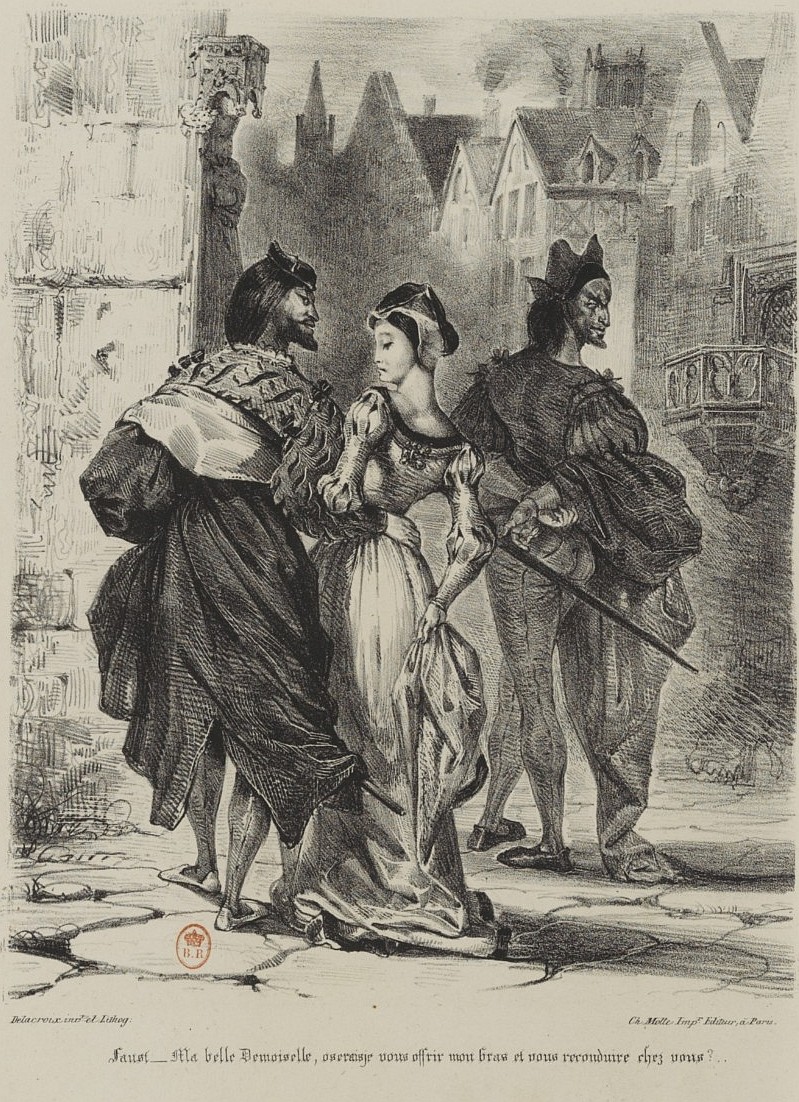 Il est certains poèmes qui ont eu de tout temps le privilège, pour ainsi dire exclusif, d'éveiller l'imagination des peintres; tels sont, entre autres et par excellence, l'Iliade et l'Odyssée d'Homère, le Paradis perdu de Milton, le Roland furieux du divin Arioste; on ferait un volume avec la simple énumération des tableaux ou dessins remarquables qu'ils ont inspirés depuis leur apparition jusqu'à nos jours. Parmi les compositions poétiques tout-à-fait modernes, qui, sous ce rapport, méritent de lutter avec celles que nous venons de nommer, le Faust de M. de Goethe doit être mis au premier rang. Ce grand homme a su donner tant de vie aux personnages fantastiques qui abondent dans cette tragédie, qu'on est obligé d'y croire comme à des personnages réels, et de leur prêter une figure, un geste, un accent particulier; on les voit agir, on les entend parler; pour chaque scène nouvelle, le lecteur, involontairement, compose en idée un nouveau tableau. Aussi plusieurs artistes habiles se sont-ils déjà essayés à reproduire les plus saillantes d'entre elles, et jusqu'à présent M. Retsch est celui d'entre eux qui a le mieux réussi dans cette tentative; ses dessins, gravés d'abord en Allemagne, où ils obtinrent le plus grand succès, furent bientôt contrefaits en Angleterre et en France, où l'on se plut également à reconnaître l'esprit, la finesse et la grâce avec lesquels leur auteur a su rendre la plupart des scènes de Faust. Mais malheureusement ce sont de simples croquis au trait, en général un peu froids, et qui même ne sont pas toujours exempts de la roideur tant reprochée aux dessins semblables, que naguère Flaxman exécuta pour Eschyle, Homère, Hésiode et le Dante.