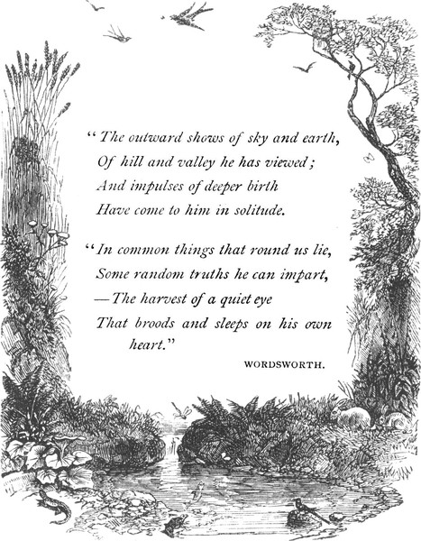xiii One word as to the title of this book. “The Harvest of a Quiet Eye.” This has always been a favourite line with me, and now I take it to describe my unpretentious volume, though this be rather a handful gleaned than a harvest got in. With some people this gleaning by the way would be contemned, in their single-eyed advance upon some goal; with some it is a thing continual and habitual, this instinctive gathering and half-unconscious storing of hints and touches of wayside beauty—a process so well described in Wordsworth’s verses. To have an eye for the wide pictures and slight studies of Nature; to gather them up, in solitary walks which thus are not lonely; to lay them by, together with the heart’s deeper thoughts, its associations, meditations, and reminiscences;—this is to fashion common things into a beauty which, to the fashioner at least, may be a joy for ever.