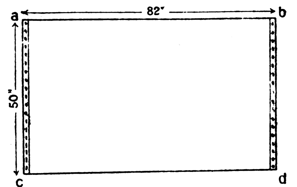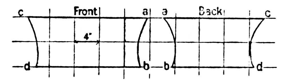 The method of draping is as follows: Tie a waist cord; take the corner b and fix it to the right-hand side of waist, then pass the edge b-a across the front of waist, round the left side towards the back, and round the back of waist again to the right side; now take up some pleats in the drapery and push them inside the waist cord in centre front of waist, then pass on the drapery round the waist to back and round to the right side again. Now catch up all the remaining drapery and throw it upwards across the chest over the left shoulder. Let the corner c hang down the back, and bring the corner around towards the front of waist and tuck it in at the left side of waist, so that it will have the thrown-over portion to the right of it. This completes this draping of an Indian sari. The width of this sari will drape a figure of 5’ 4”, most of those worn by Indian women are narrower.{41}