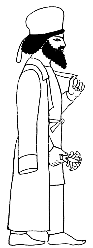 Fig. 30 represents King Assur-nasir-pal (ninth century B.C.) wearing a tunic of similar type to Plate XI., but long. Tied at his waist and covering the back half of his figure is a small richly decorated shawl about 20 inches square. Note the tassels hanging from right-hand bottom corner; these would be the same on the left-hand bottom corner. He also wears the belt mentioned in connection with Plate XI. The wavy tassels which look like horsehair hang from his sword belt; a tassel also hangs from the back of his necklace, and two ribbons from his cap-band. Note the similarity of this cap to the so-called fez or tarbush worn in Assyria at the present day.{53}
