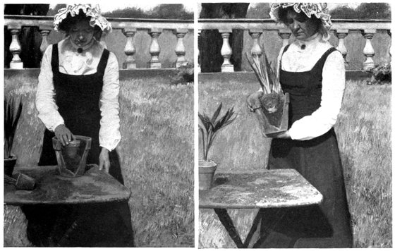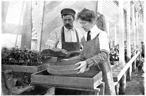 In making beds that have been worked before and need no enriching, excellent results may be secured by pushing a long spade into the ground the 8whole length of its blade and twisting it around. This breaks up and mellows the ground more effectually than turning it over, while it leaves the good soil on top where the young plant-roots can get it. Later, when the plant grows sturdier and stretches out its roots in search of food, the manure-enriched earth in the bottom of the bed will attract and draw them down into its cool, moist depths, away from the heat and drought of the surface. But the young plants must have mellow, nourishing soil from the start, or they will perish before they reach this store-house provided for the mature plant.