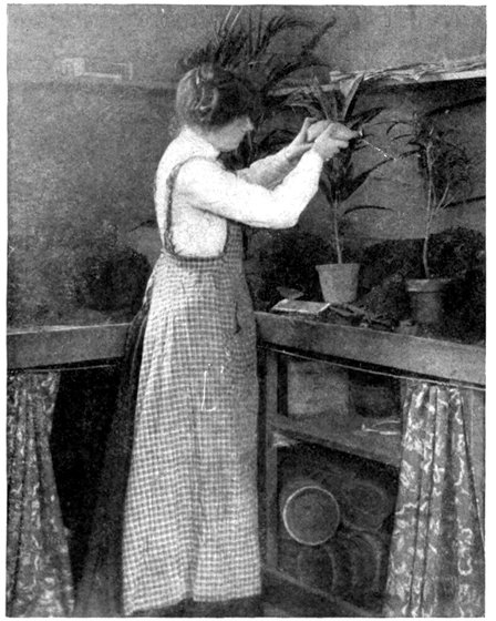 For watering the window-garden, a small pot with a long spout that will go between the plants will be a great convenience, as by its use the farthest plants may be watered without disturbing the others. This means a saving of time on busy mornings, and insures against neglect.