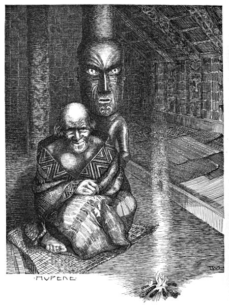 Dreamily is Ngawai staring into the embers, whilst the pale new morning is crawling through the spaces between the fern-stems which form the walls of the mountain-whare (hut).