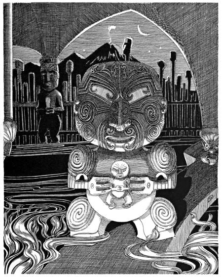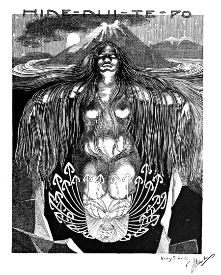 Down along the narrow ridge to the tideway they move, until they reach the ghostly leaping-place, tapu to the manes of the innumerable multitude of dead. Here grew a venerable pohutukawa tree, gnarled and knotty, with great ropy roots trailing to the tide. By these roots the spirits dropped to the sea, loosing their last grip of Ao-tea-roa to the dirge of the screaming sea-birds and the moaning waves. Below, the tossing sea-kelp opens a moment to receive the wairua, and then the dark waters close over them for ever. This is the Tatau-o-te-Po, the Door of Death, which is the entrance to the gloomy Kingdom of Miru, the Goddess of Eternal Night.