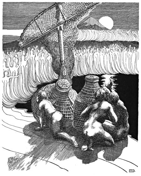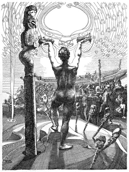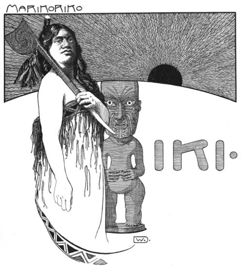 The sharp-edged coke-rocks cut the feet of the bearers, and the sulphur in the air is the deadliest foe to frolic—and what can be properly done without frolic in Maoriland? The feet of the bearers begin to bleed, the incantations of the Tohungas grow weaker; less overbearing, too, become the songs of defiance which Iwikau is shouting to the gods: silence and ghostly fright fall upon the multitude.
