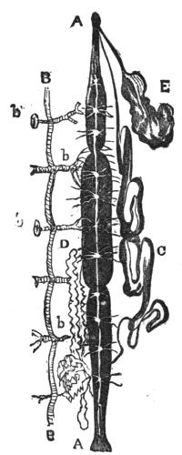 Now if the bones of the fingers were drawn out like wire until they became some seven or eight feet long, and the skin between them were extended to the nails of the elongated fingers, we should have a structure analogous to that of the bat’s wing. The thumb joint is left comparatively free; and by means of this joint, and the hooked claw at its extremity, the creature walks on a level surface, or can crawl suspended from a beam or a trunk. It is very curious to see the bat stretching out its wings and feeling about for a convenient spot whereon to fix the hooks.