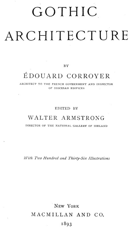 The following pages, which have been translated under my supervision by Miss Florence Simmonds, give such an account of the birth and evolution of Gothic Architecture as may be considered sufficient for a handbook. Mons. Corroyer writes, indeed, from a thoroughly French standpoint. He is apt to believe that everything admirable in Gothic architecture had a Gallic origin. Vexed questions of priority, such as that attaching to the choir of Lincoln, he dismisses with a phrase, while the larger question of French influence generally in these islands of ours, he solves by the simple process of referring every creation which takes his fancy either to a French master or a French example, here coming, be it said, into occasional collision with his own stock authority, the late Mons. Viollet-le-duc. The Chauvinistic tone thus given to his pages may be regretted, but, when all is said, it does not greatly affect their value as a picture of Gothic development. Mons. Corroyer confines himself in the main to broad[vi] principles. He travels along the line of evolution, pointing out how material conditions and discoveries, and their consequent social changes, brought about one development after another in the forms and methods of the architect. In a treatise so conceived, the fact that the field of observation is practically restricted to France, the few excursions beyond her frontier being made rather with a view to displaying the extent of her influence than with any desire for catholicity of grasp, is of no great moment. The English reader for whom this translation is intended, will get as clear a notion of how Gothic, as he knows it, came into being, as he would from a more universal survey, while he has the advantage of some echo, at least, of the vivacity, which inspires a Frenchman when his theme is "one of the Glories of France."