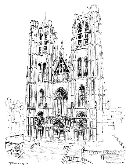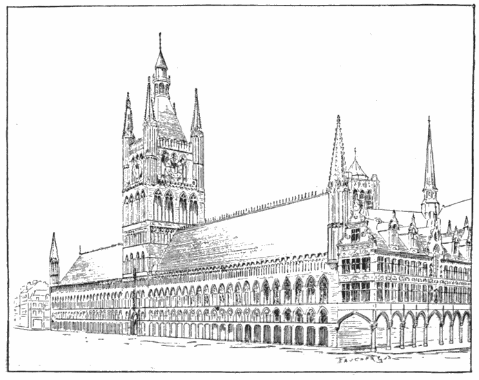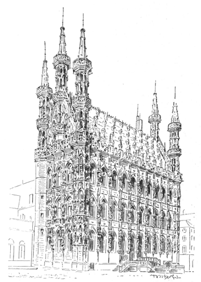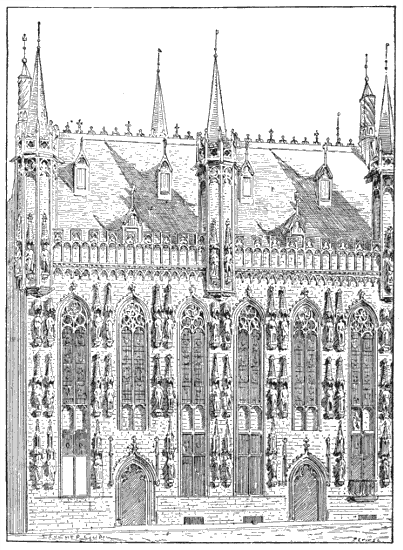 We may close the list of Belgian town-halls of the fourteenth and fifteenth centuries with that of Louvain. The design and general scheme of elaborate decoration are akin to those of the hall of Bruges, and it bears the same ecclesiastical impress.