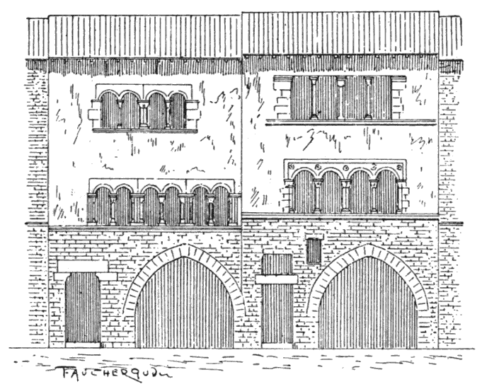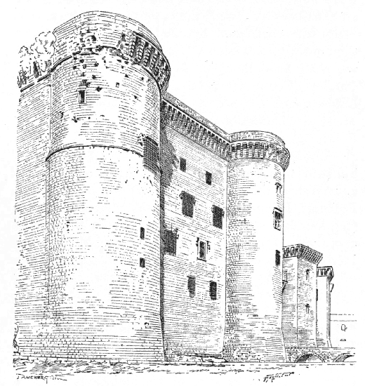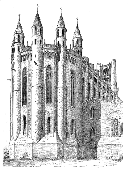 The archbishop's palace at Albi has all the character of a feudal castle. Its buildings are protected by a keep, and encircled by walls and towers[386] connected both with the ramparts of the city, and with that more important fortalice, the cathedral itself, the tower of which is, in fact, a formidable keep.[76]