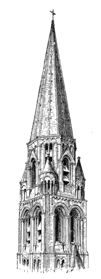 The structure usually formed part of the town-hall, but was sometimes an isolated building. The isolated belfry was a great square tower of several stories, crowned by a timber roof protected either by slates or lead. The great bells hung in one story, and above them the little bells of the carillon.