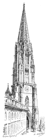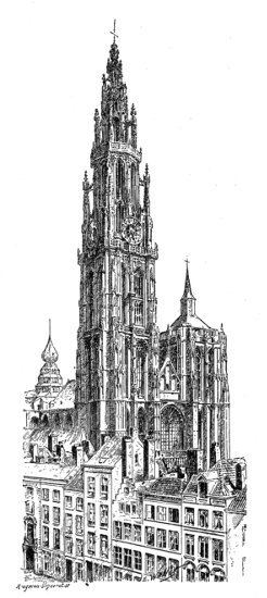 We shall find examples of these early municipal buildings among the isolated belfries of Belgium, such as that at Tournai, founded in 1187, and[375] rebuilt in part at the close of the fourteenth century, and that of Ghent, the square tower of which dates from the end of the twelfth century. Its spire is a modern addition.