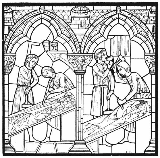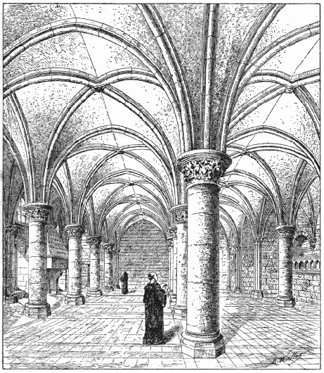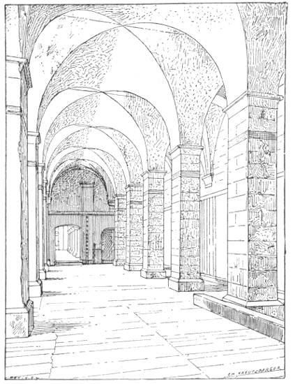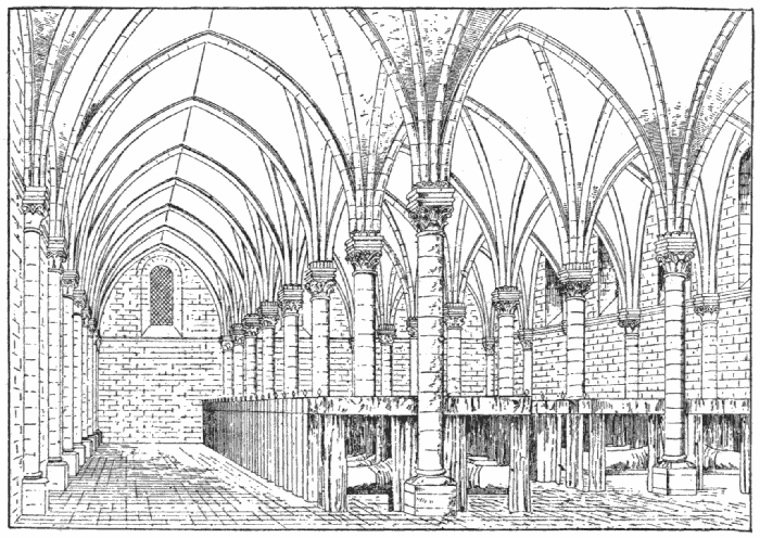 The canons' lodgings were also in close proximity to the cathedral, but on the side opposite to the bishop's palace. They were surrounded by an en[384]closure, the gates of which were fastened at night. It was the duty of the canons to aid the bishop in his ministrations. They lived together in annexes which communicated with the cathedral by means of galleries and cloisters.[74]