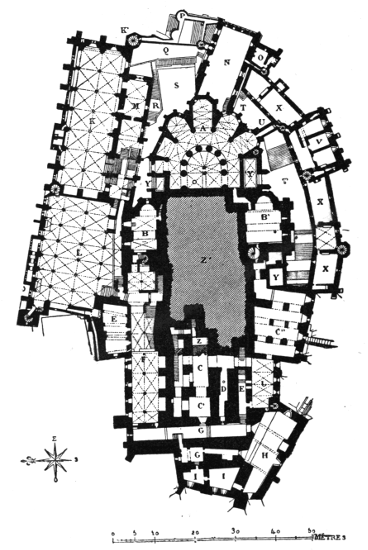 The courts, parliaments, and tribunals of the executive were held in the palace of the suzerain or the bishop, where certain of the buildings were open to the public. The important feature, the great hall (grand salle), occupied a vast covered space in which the plenary courts were held, the vassals assembled, and banquets were given. It communicated with galleries or ambulatories. A chapel was[381] always included in the plan of the palace, which consisted of the lodging of the lord and his followers; offices, often of great extent; rooms for the storing of archives; magazines, prisons, and innumerable auxiliary buildings, divided by courtyards, and in some cases by gardens.