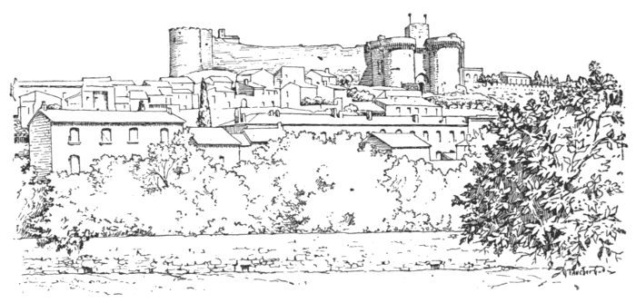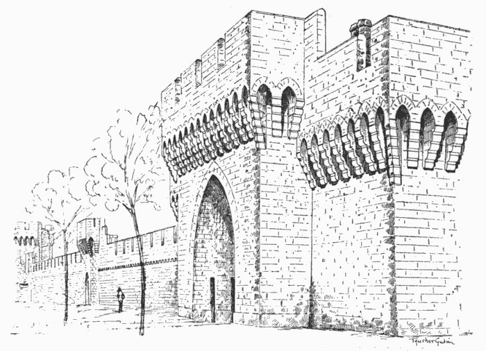 The Popes, having established themselves at Avignon in the fourteenth century, built a huge mansion on the rock known as the Rocher des Doms, which overlooks the Rhone. In 1336 Benedict XII., having destroyed his predecessor's palace, laid the foundations of the immense fortified pile now in existence. The plans were the work of the French architect, Pierre Obrier. The building was added to by the successors of Benedict XII., Popes Clement VI., Innocent VI., and Urban V., and was completed, or at any rate made efficient for defence, by 1398, when Pedro de Luna, who became pope under the title of Benedict XIII., sustained a memorable siege therein.