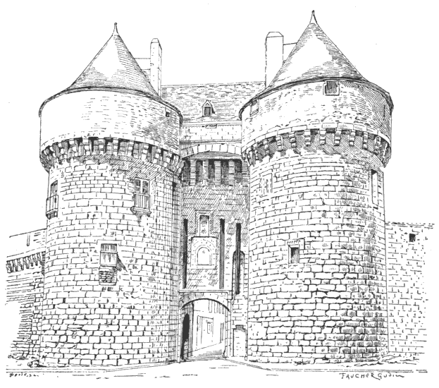The gate-house of the hôtel de ville at Bordeaux, known as the grosse cloche, is an example of the[379] more ancient usage. Here we find the bell hung over the gateway, as already described. The belfry of Bordeaux, which appears to date from the fifteenth[380] century, is very remarkable. It consists of two towers connected by a curtain through which is an arched passage. A second arch protects the great bell in the upper story, and the whole is surmounted by a central roof, flanked right and left by the conical crowns of the lateral turrets.