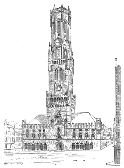 Belfries.—In the early days of the enfranchisement of the communes, it became customary to call the community together by means of bells, which at that period were confined to the church towers, and which it was unlawful to ring without the consent of the clergy. It may easily be conceived to what incessant broils the new order gave rise, the clergy as a body being strongly opposed to the separatist tendency of measures which attacked their feudal[373] rights. The municipalities finally put an end to internecine warfare in this connection by hanging bells of their own over the town-gates, a custom which was superseded towards the close of the twelfth and beginning of the thirteenth century by the erection of towers for the civic bells. Such was the origin of the belfry, the earliest material expression of communal independence.