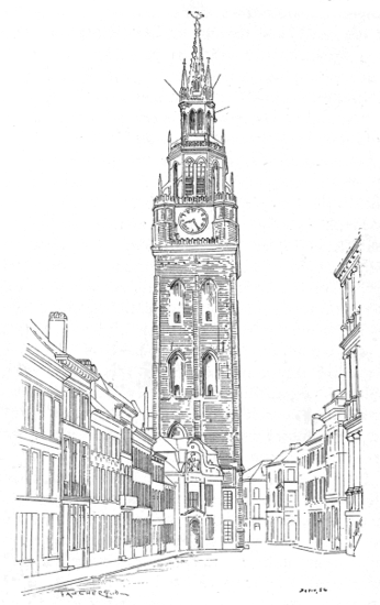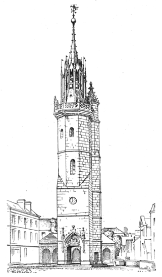 A few buildings of this particular class still exist in France. Such is the belfry of Calais, the square tower of which was built during the fourteenth and fifteenth centuries. It is crowned by an octagonal superstructure, begun at the close of the fifteenth century, and completed in the early years of the seventeenth. The belfry of Béthune, which dates from the fourteenth century, is another. It consists of a square tower reinforced at three of its angles by a hexagonal turret, corbelled out from the wall. The fourth turret is of the same shape, but here the projection is carried up from the ground-floor, and contains the spiral staircase which communicates with the various stories of the tower, and terminates on the embattled parapet above. The building is completed by a pyramidal spire of great elegance, crowned by the watchman's tower. The plan and details of this superstructure proclaim it the source whence the gable turrets of Louvain were derived. The great bells hang in the uppermost story, the smaller ones of the carillon in the story below. On each façade at the summit of the tower a great dial marks the hours, as was customary from the fourteenth century onwards, when town-clocks first came into general use.
