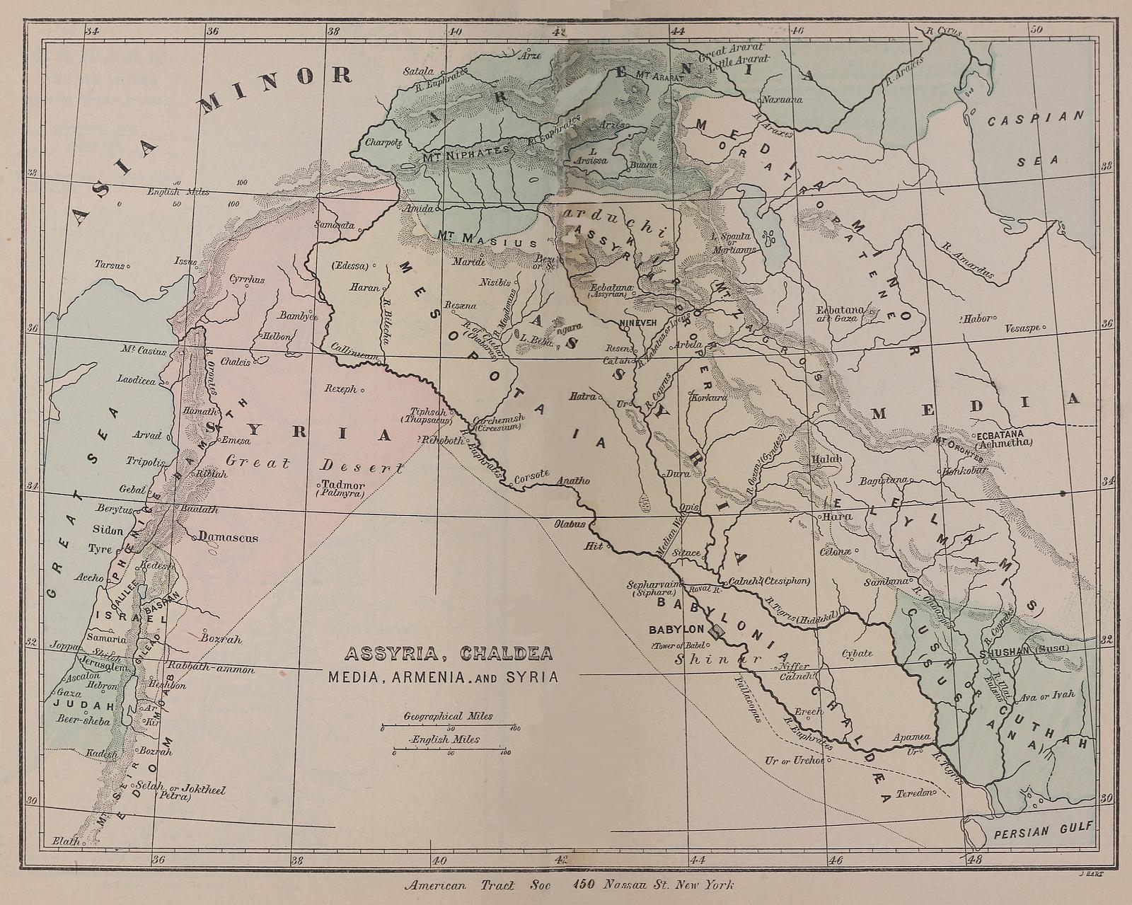 The Tigris is shorter, being about 1,150 miles in length, and navigable for rafts for 300 miles. Some of the extreme head-sources of this river approach those of the Euphrates within the distance of two or three miles. The name Hiddekel is the same word as Hidiglat, which is its name in the Assyrian inscriptions, as Purat is the ancient Assyrian for Perath in Hebrew.4