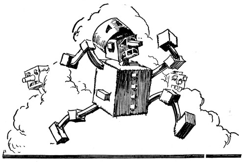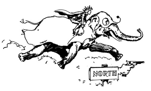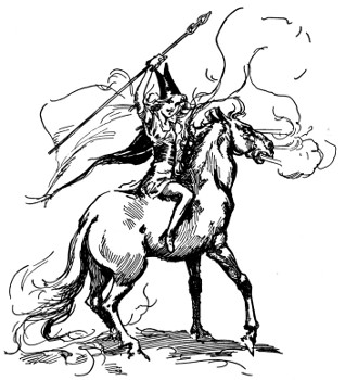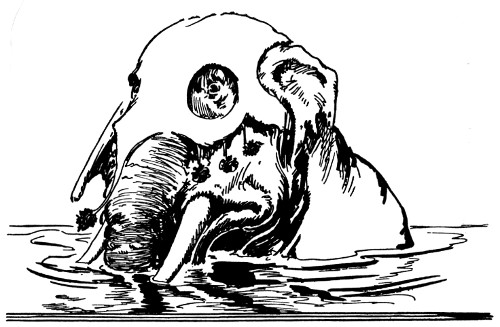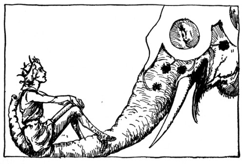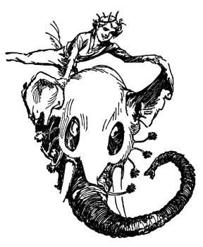 "And about time," fumed an indignant voice, as Kayub reluctantly drew the bolts and, swinging wide the doors, stepped back to let a magnificently caparisoned elephant swing through. "A fine welcome this is, I must say, for the Elegant Elephant of Oz! Out of my way, wart!" Picking Kayub up in his trunk, the visitor jammed him down hard into a golden trash barrel, trumpeted fiercely at the double line of guards who had instantly sprung to attention, and went swaying across the courtyard.