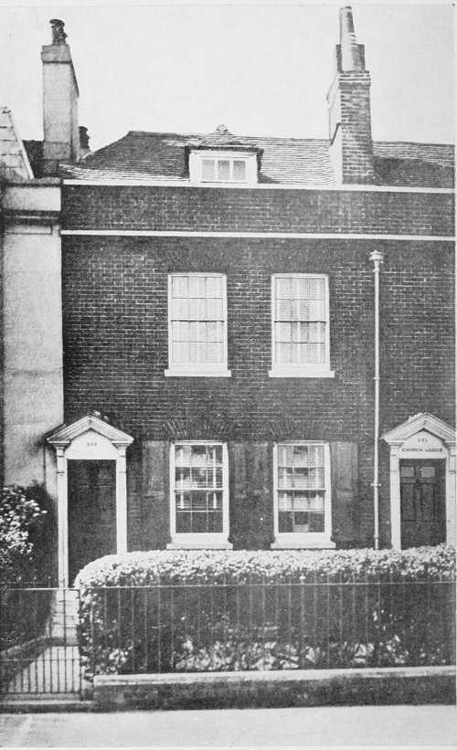 The birthplace of Charles Dickens, which less than half a century ago overlooked green fields, is an interesting survival of those days of arboreal delights; and the broad road, on the west side of which it is situated, leads to Cosham and the picturesque ruin of Porchester Castle. In 1809 John Dickens was transferred from Somerset House to the Navy Pay-Office at Portsmouth Dockyard, and, with his young wife, made his home here, in which 3 were born their first child (Frances Elizabeth) in 1810, and Charles on February 7, 1812. This domicile is a plain, red-brick building containing four rooms of moderate size and two attics, with domestic offices; in front there is a small garden, separated from the public roadway by an iron palisading; and a few steps, with a hand-rail, lead from the forecourt to the hooded doorway of the principal entrance. The front bedroom is believed to be the room in which Dickens was born. From the apartments in the rear there is still a pleasant prospect, overlooking a long garden, where flourishes an eminently fine specimen of the tree-mallow. On the death of Mrs. Sarah Pearce, the owner and occupier (and last surviving daughter of John Dickens’s landlord), the house was offered for sale by public auction on Michaelmas Day, 1903, when, much to the delight of the townspeople as well as of all lovers of the great novelist, it was purchased by the Portsmouth Town Council for preservation as a Dickens memorial, and with the intention of adapting it for the purposes of a Dickens Museum. The purchase price was £1,125, a sum exceeding by five hundred pounds the amount realized on the same occasion by the adjoining freehold residence (No. 395), which is identical in character—an interesting and significant testimony as to the sentimental value attaching to the birthplace of “Boz.”