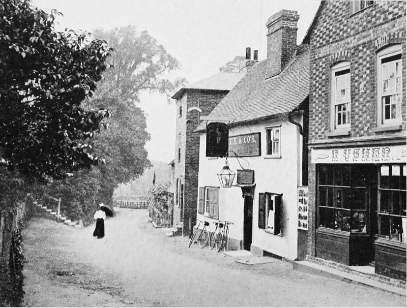 Visitors to Cooling cannot fail to notice in the churchyard a long row of curious gravestones which mark the resting-place of members of the Comport family of Cowling Court (Cooling was originally called Cowling), these memorials dating from 1771, the year recorded on a large headstone standing in close proximity. These suggested to Dickens, of course, the idea of the “five little stone lozenges” under which the five little brothers of Pip lay buried. Within a short distance from the churchyard we may identify, in a short row of cottages, the original of Joe’s forge, while an old-fashioned inn with a weather-board exterior, and bearing the sign of the 214 Horseshoe and Castle, is regarded as the prototype of the Three Jolly Bargemen, a favourite resort of Joe Gargery after his day’s work at the forge.