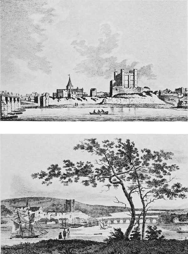 The ancient and picturesque city of Rochester, so beloved by Dickens and so replete with memories of the “Master,” deserves a chapter to itself. With the exception of London, no town figures so frequently or so prominently in his books as Rochester, from “The Pickwick Papers” to the unfinished romance of “The Mystery of Edwin Drood,” where it is thinly disguised as “Cloisterham.” Dickens’s acquaintance with Rochester began in the days of his boyhood, when he lived with his father at Chatham, and, as a natural result of his unusual powers of observation, he even then stored up his youthful impressions of the quaint old houses, the Cathedral, and its neighbour, the rugged ruins of the Norman Castle overlooking the Medway. How those juvenile impressions received something of a shock in after-years we are informed by Forster, for childhood exaggerates what it sees, and Rochester High Street he remembered as a thoroughfare at least as wide as Regent Street, whereas it proved to his maturer judgment to be “little better than a lane,” while the public clock in it, once supposed by him to be the finest clock in the world, proved eventually to be “as moon-faced and weak a clock as a man’s eyes ever saw.” Even the grave-looking Town Hall, “which had appeared to him once so glorious a structure” that he associated it in his mind with Aladdin’s palace, he reluctantly realized as being, in reality, nothing more than “a mere mean little heap of bricks, like a chapel gone demented.” “Ah! who was I,” he observes on 215 reflection, “that I should quarrel with the town for being changed to me, when I myself had come back, so changed, to it? All my early readings and early imaginations dated from this place, and I took them away so full of innocent construction and guileless belief, and I brought them back so worn and torn, so much the wiser and so much the worse!”