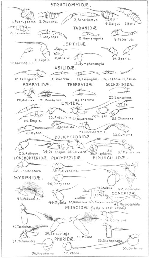 The second sub-division comprises many families, including the muscid-like flies, of which the house-fly is the type. The flies of this type are to be found in the families of Muscida, Anthomyida, Tachinida, and Cordylurida, comprising nearly 700 British species, of which many rather closely resemble one another when superficially observed.