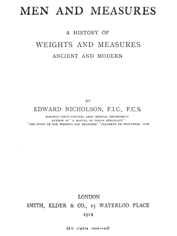 This history is the development of a short story of the Imperial System of Weights and Measures published eleven years ago, but withdrawn when this fuller work took shape. To have made it at all complete would have required a long lifetime of research; to give and discuss every authority, to trace, even to acknowledge, every source of information would have unduly swollen the volume and slackened the interest of the narrative. I offer it with all its shortcomings as an attempt to show the metric instincts of man everywhere and in all time, to trace the origins and evolution of the main national systems, to explain the apparently arbitrary changes which have affected them, to show how the ancient system used by the English-speaking peoples of the world has been able, not only to survive dangerous perturbations in the past, but also to resist the modern revolutionary system which has destroyed so many others less homogeneous, less capable of adaptation to circumstances.