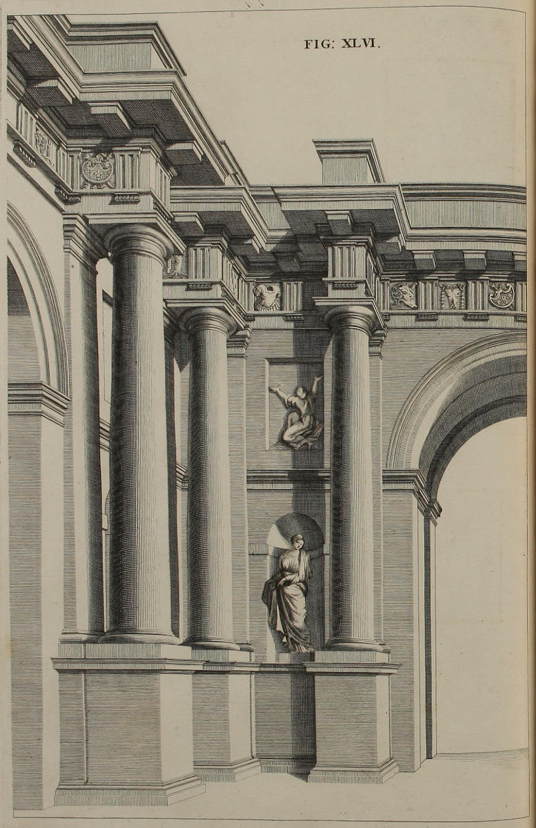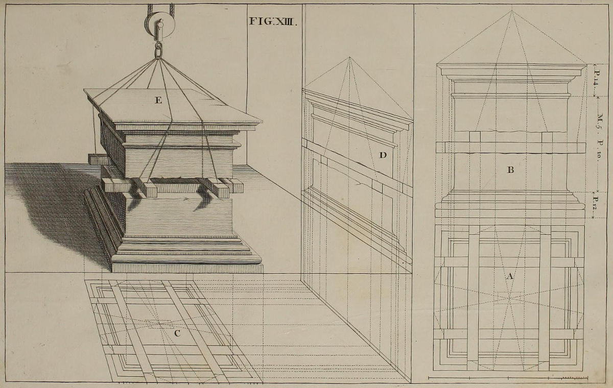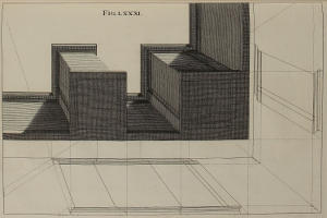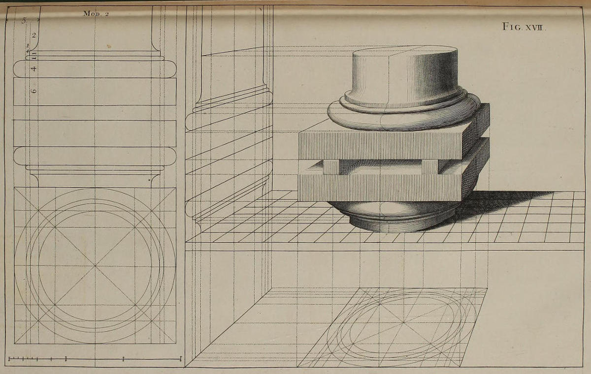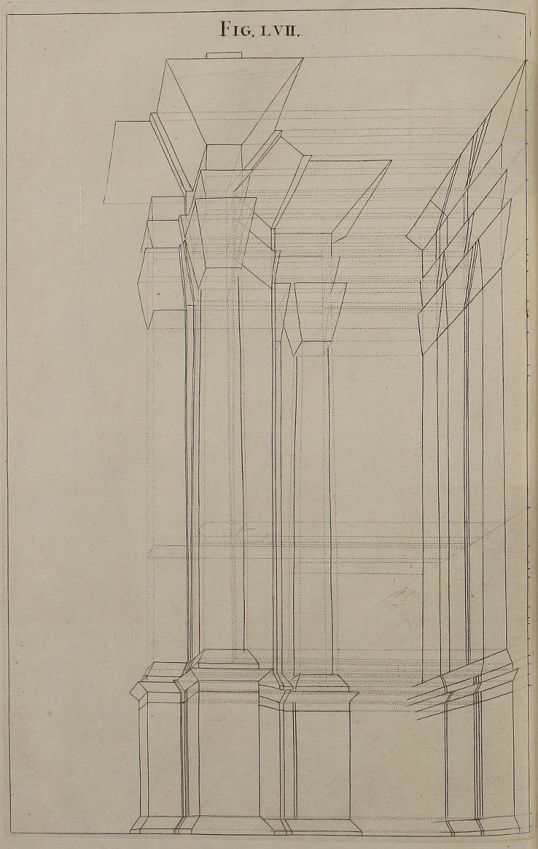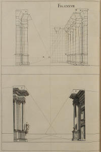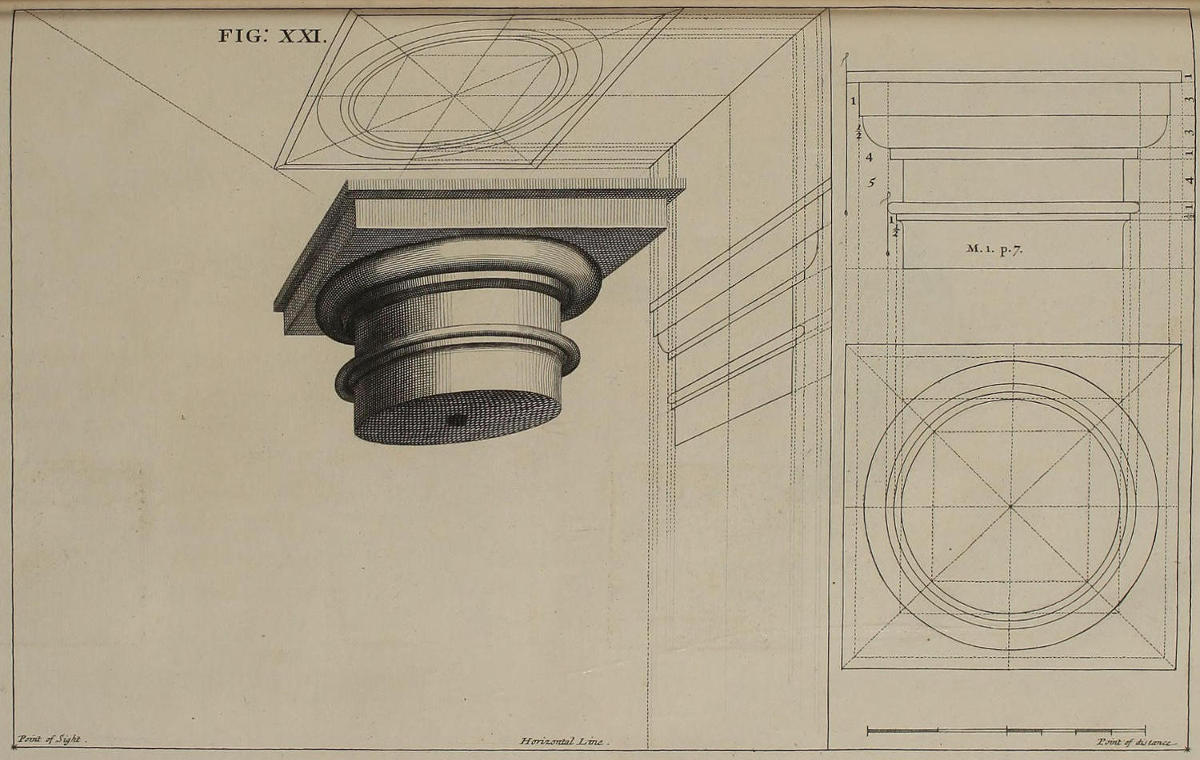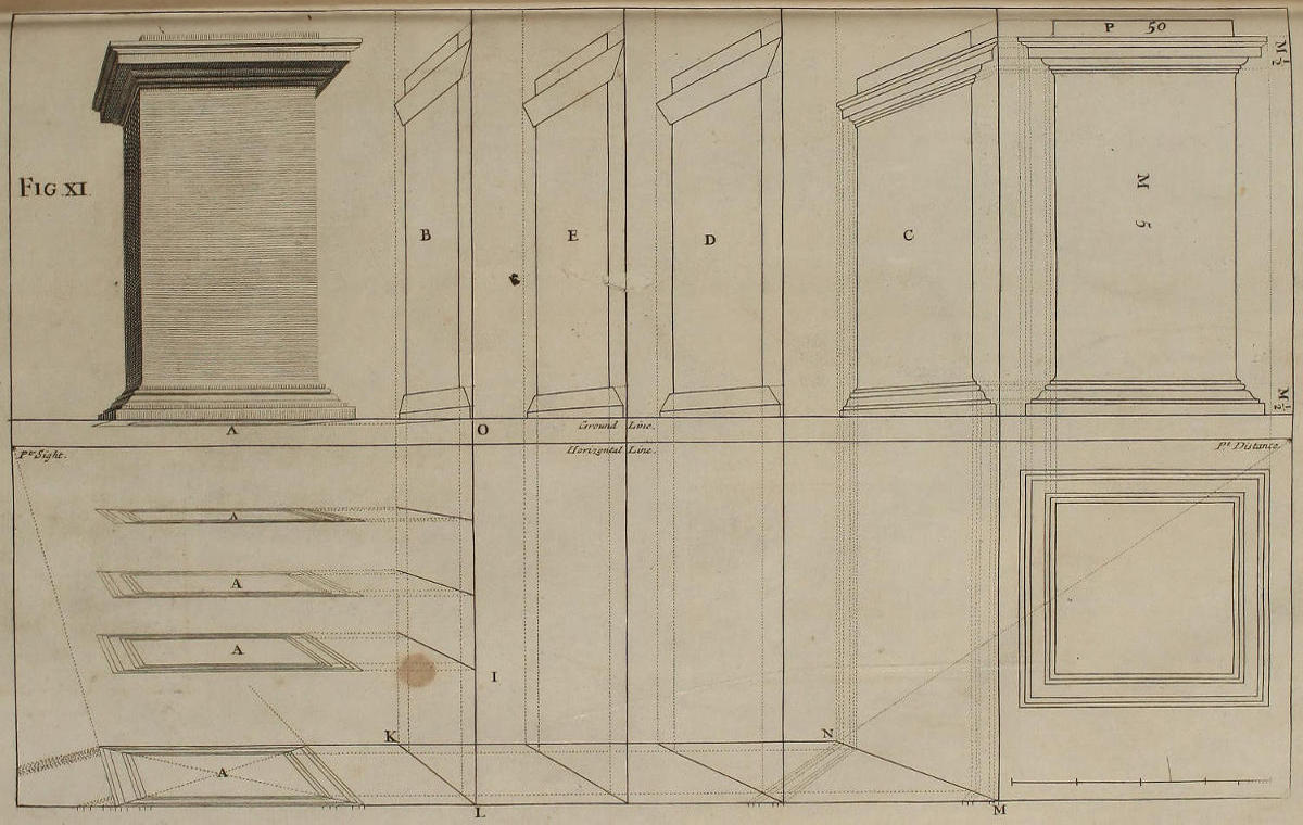 The Perspective of Structures here treated of, can have no Grace or Proportion, without the Help of Architecture. ’Tis therefore absolutely necessary, that you employ yourself for some time in Drawing, and the Study of that Art; till you can readily describe the Plan of any Upright, and from thence project the Section or Profile, as is shewn through the whole Course of this Work; and more particularly, in the Sixty-eighth and Seventieth Figures: Forasmuch as the proper Depth of each Part of the Perspective, is determin’d by the Plan and Profile thereof.