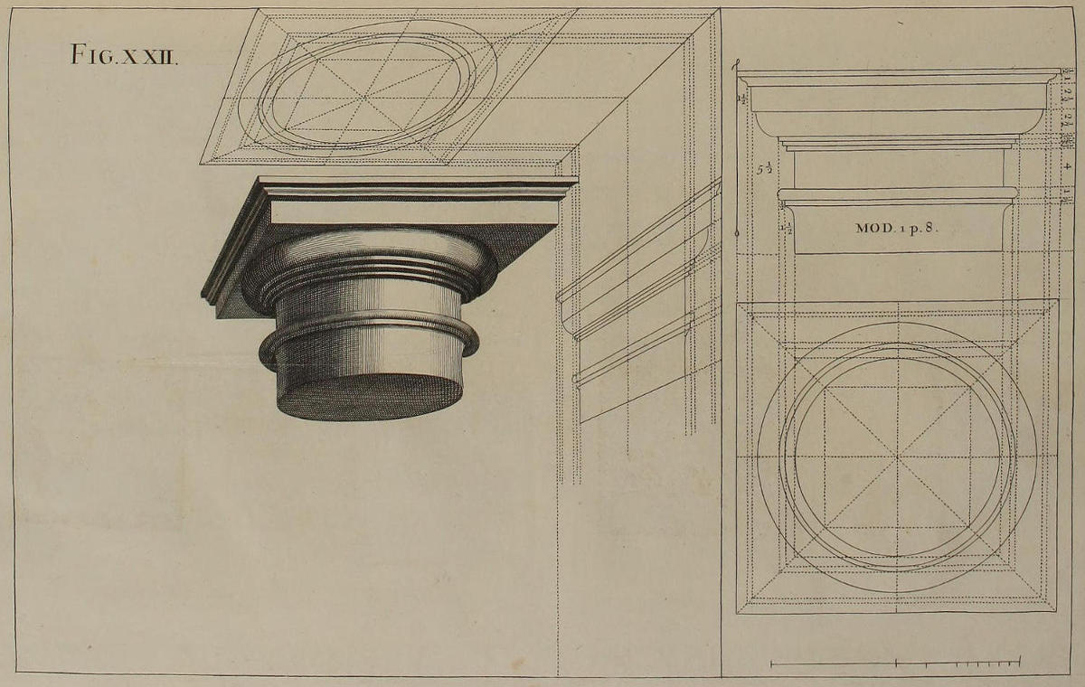| Optica projectio capitelli Dorici, | XXII. | The Projection of a Dorick Capital in Perspective. |