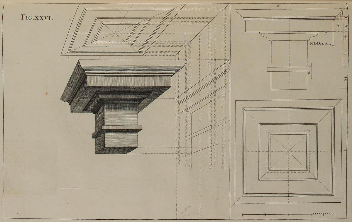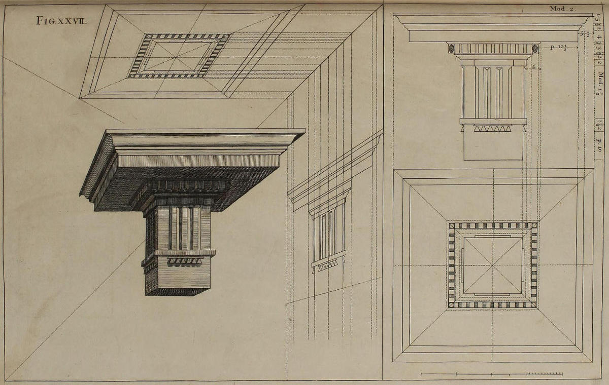 | Optica delineatio coronicis Doricæ, | XXVII. | The Dorick Entablature in Perspective. |