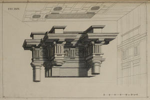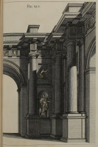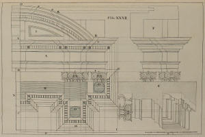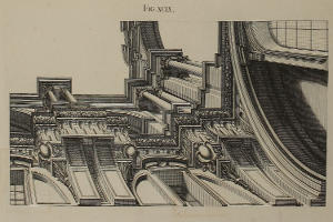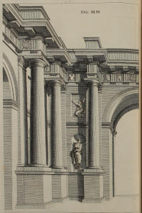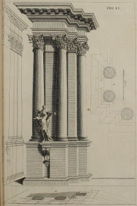 | Optica projectio ædificii Ionici; ubi de modo jungendi fictum cum vero, | XXX. | An Ionick Work in Perspective, with the Manner of reconciling the fictitious to the solid Architecture. |