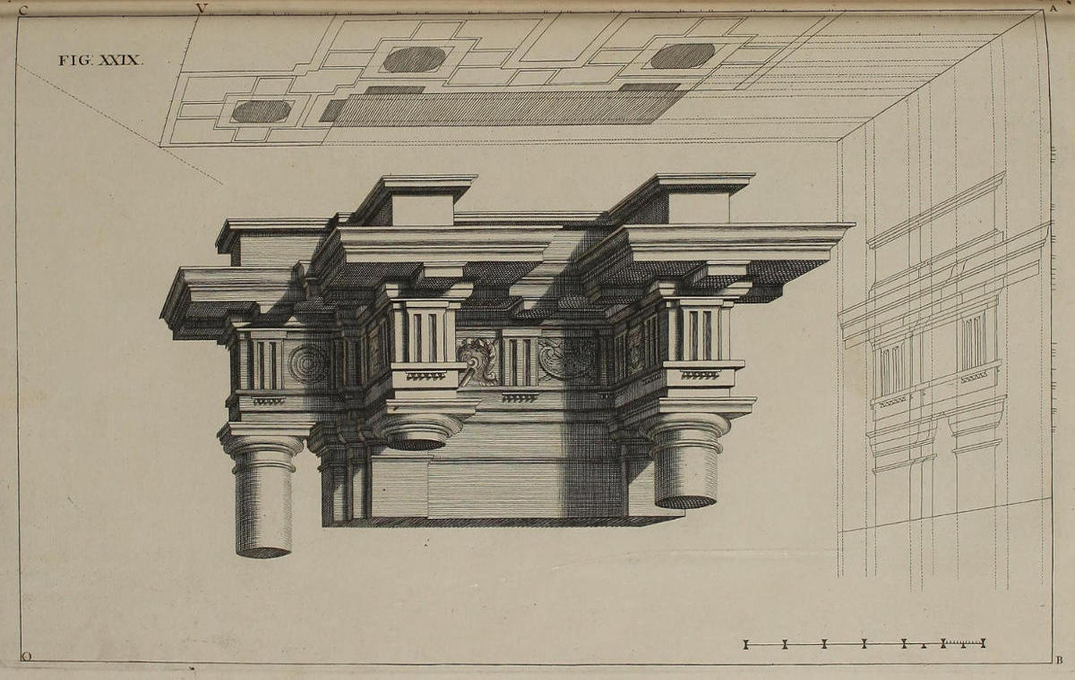 | Optica projectio ædificii Dorici, | XXIX. | A Projection of the Dorick Order in Perspective. |