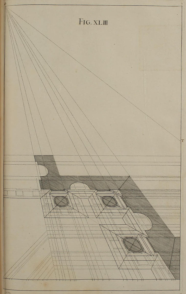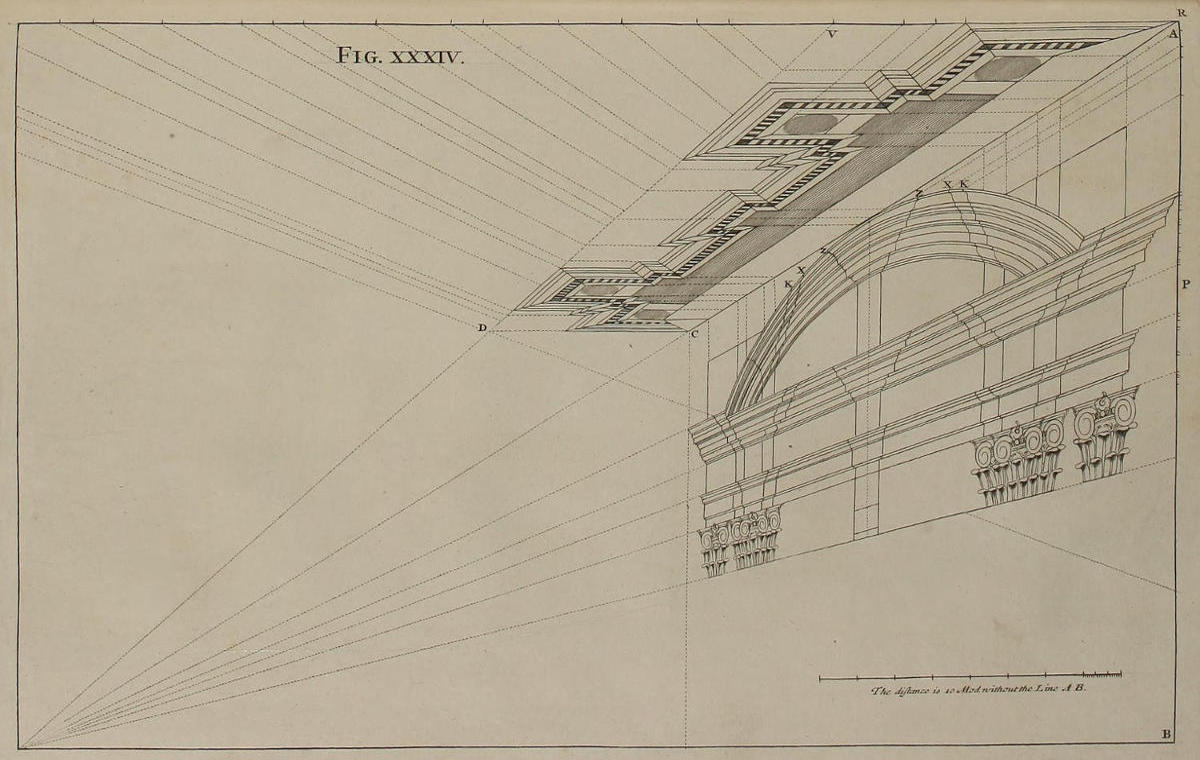 ’Tis something unaccountable, that, among so many learned Persons as have handled this Subject, Priests, Architects, and Painters; very few, if any of them, have given Directions proper for shunning that Disorder and Confusion of Lines, which, in most Instances, must necessarily attend the Execution of their Rules: In all or most of which, the whole Space for the Performance is confin’d between the Lines of the Plan and Horizon; which, where the Scale is small, and the Height of the Eye not very much advanc’d, renders the Work exceedingly confus’d; and where those Lines are coincident, (which frequently happens) the Method becomes utterly impracticable.