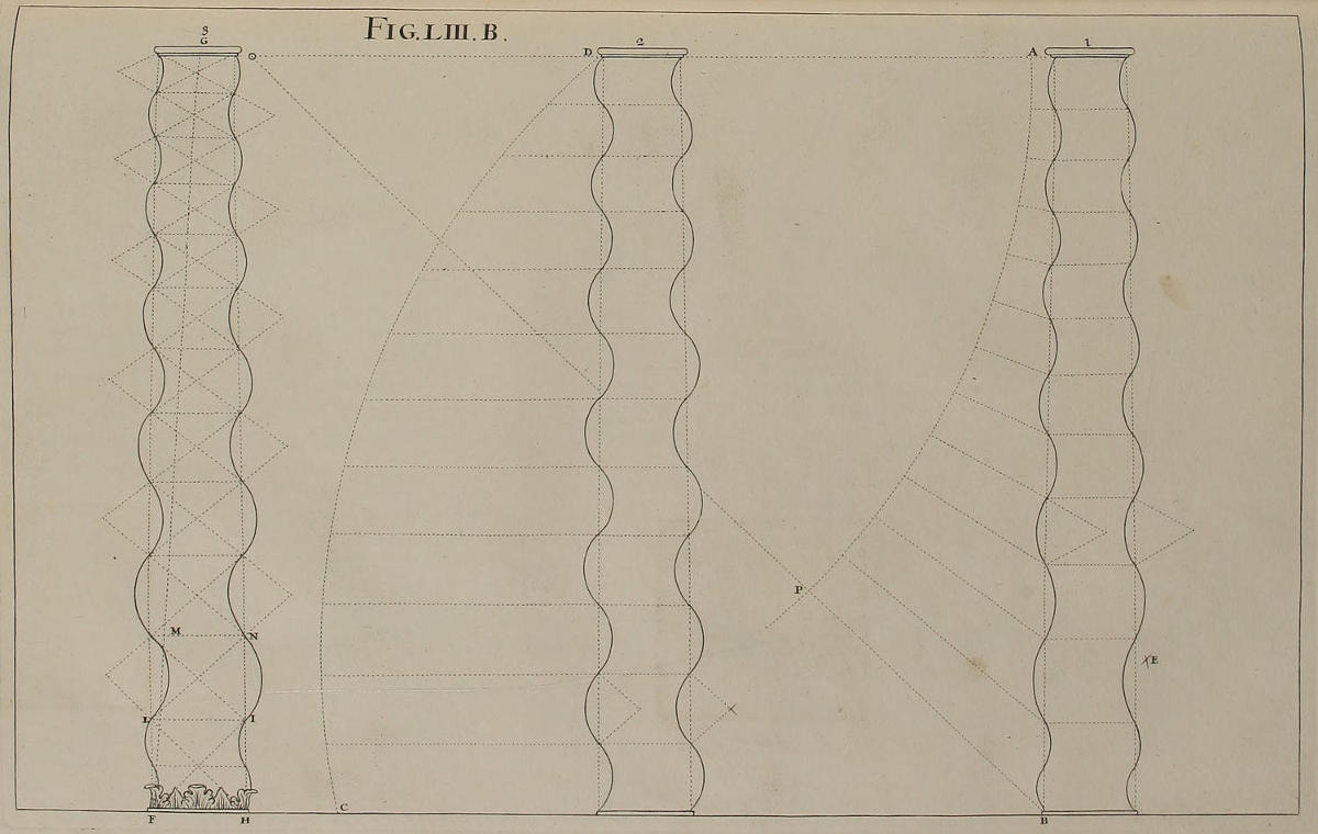 | Modus triplex delineandi columnas spirales, | LIII. B. | Three different ways of delineating wreath’d Columns. |