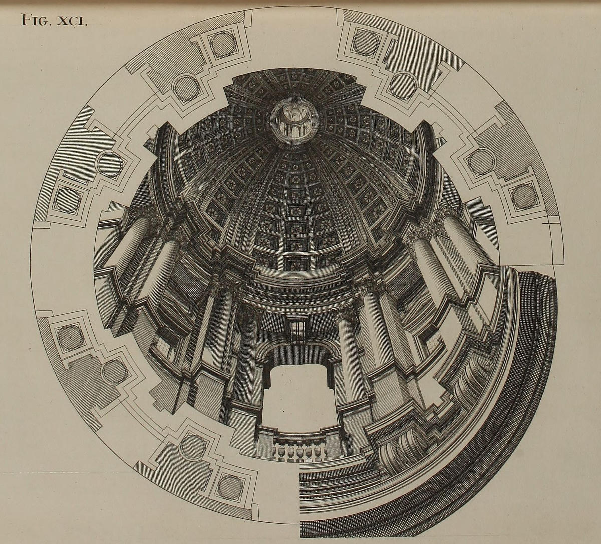 | Tholus figuræ nonagesimæ, cum luminibus & umbris, | XCI. | The Cupola of Fig. 90, with its Lights and Shades. |