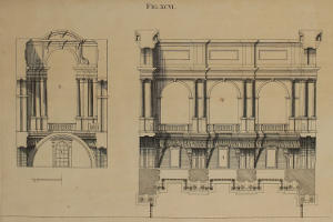 The Manner of Designing, where the Perspective is drawn on several Ranges of Frames one behind the other, and such Scenes of Theaters whose Grooves lie oblique to the middle Line, is also here laid down: And by our Author’s Method, Horizontal Perspective, or that of Ceilings, is render’d less difficult than the Vertical, or that against an upright Wall. Upon the whole, nothing seems wanting that may make a Work of this nature complete; unless what concerns Designs which are either Circular, or abound with many Columns: For the Performance whereof, the Author, as he promises in the Sixty-fifth Figure, has, in a SECOND Volume, given a Rule more proper for the purpose; which also may possibly be made English in due time, if this Part meet with Encouragement.