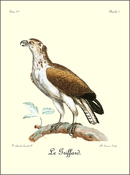 Une courte et succincte description des couleurs du Griffard suffira maintenant pour ne pas le faire confondre ni avec le grand aigle ni avec aucun des aigles qui ont été décrits jusqu’à ce jour. Il a le dessous du corps, depuis la gorge jusqu’à la queue, y compris les jambes et les tarses, d’un beau blanc. Le dessus de la tête, le derrière et les côtés du cou sont couverts de plumes blanches à leur origine et d’un gris brun vers la pointe; le blanc s’aperçoit autant que le brun vers les joues et dans quelques endroits du cou, ce qui forme une espèce de tigré fort agréable. Le dos et les couvertures de la queue, sont brunâtres; tout le manteau est de cette dernière couleur, mais chaque plume est bordée d’une teinte plus claire que le fond; les grandes pennes de l’aîle sont noires; les moyennes sont rayées transversalement d’un blanc sale et de noirâtre; les dernières sont bordées de blanc à leur pointe; la queue est rayée de même que les moyennes pennes de l’aîle.